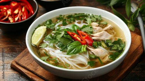 The national cuisine of Vietnam: Vietnamese soup "Pho" with chicken.