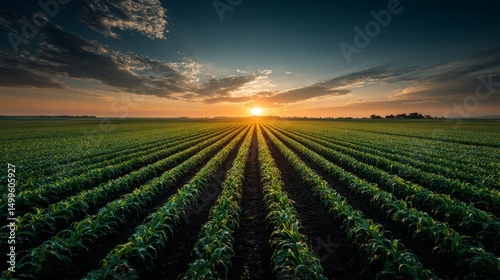 The neatly arranged crops extend to the horizon, and the morning sun shines on the cloudless sky. The digital point like intelligent sensors in the fields symbolize innovation and a new beginning.