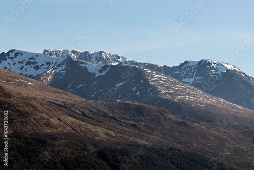 The Nevis Range mountains on a clear day. Aonach Mor slopes in the foreground, then Carm Mor Dearg with the summit of Ben Nevis behind. Lochaber, Scotland.