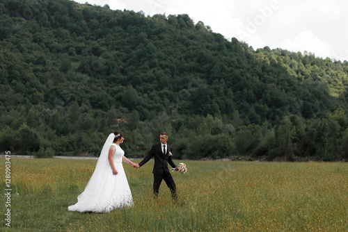 The newlyweds walk across the field holding hands. In the background you can see green hills and trees, as well as a cloudy sky.