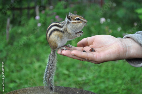 The next visit of a wild, but friendly and sociable chipmunk to his friends in the woods in the country