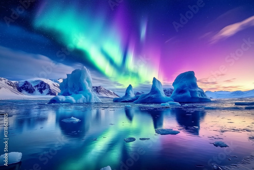 The Northern Lights dancing above Lagoon, showcasing the vivid green and purple auroras reflecting on the icy waters.