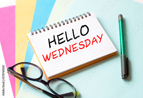The Notepad with the text Hello Wednesday is on colored paper with glasses and a pen