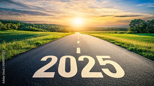The number "2025" is written on the asphalt road leading into an open field, with the sun rising in the background. The scene features a beautiful sky and lush greenery.
