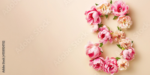 The number 8 is made of beautiful natural pink peonies on a pastel beige background