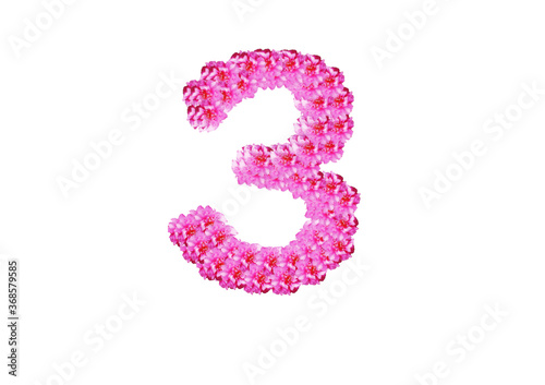 The number three is made of pink flowers on a white background. Spring concept Floral letters of the alphabet for wedding design or flower festival