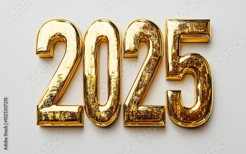 The numbers "2025" formed with shiny, polished gold bars arranged on a pure white background