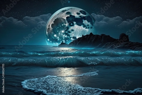 The ocean reflects the full moon in all its blue glory. A tidal wave that reaches the island from the sea. There are a lot of stars up there. Similar like the sound of river waves on a moonless night