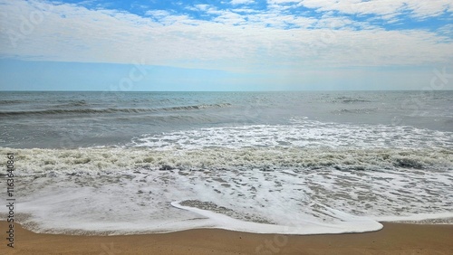 The ocean wave on high tide day in rain season with cloudy sky beach landscape.