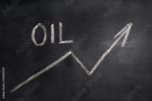 the oil price is very high. simbol of an up arrow and the word oil written on a blackboard