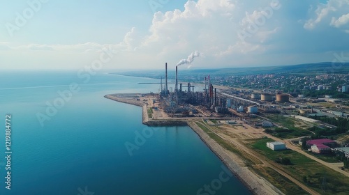 The oil refinery is located by the sea. No pollution. The surrounding area has clean air. Aerial view.
