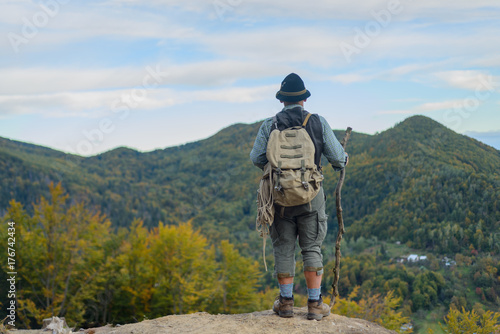 The old man stands on the top of the mountain and enjoys the view of the autumn mountains. An elderly man is an active and healthy lifestyle.