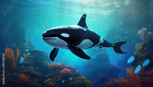 The Orcinus Orca in the ocean, portrait of Orca hunting prey in the underwater