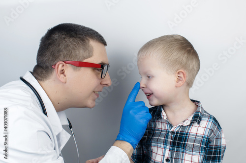 The otolaryngologist examines the boy nasal passages. Painful sensations in the nose, polyps, adenoids and shortness of breath. Fractures of the cartilage tissue of the nose