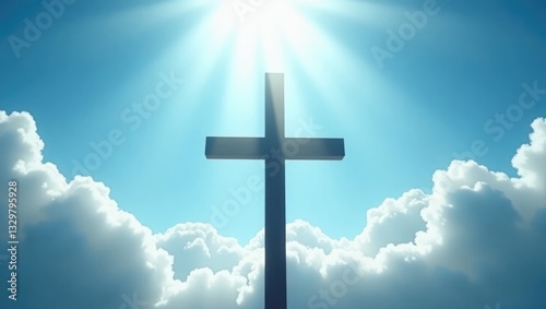 The outline of the cross against sunlight as a representation of faith. Concept related to paradise, religion, and divine light. Background.