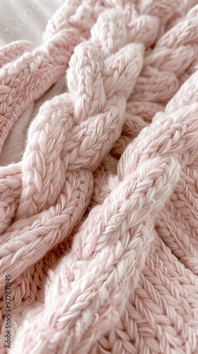 The oversized knit blanket in soft pink colors displays intricate stitching and a comforting texture, perfect for chilly evenings at home