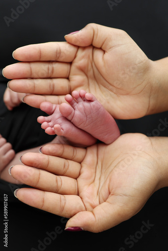 The palms of the parents. A mother hold the feet of a newborn child in a black blanket on a Black background. The feet of a newborn in the hands of parents. Macro Photo of foot, heels and toes