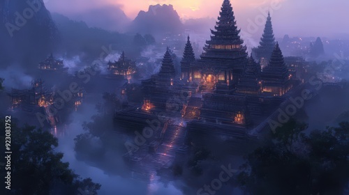 The panoramic view of a temple complex at twilight, with soft lighting illuminating the structure and creating a serene glow.