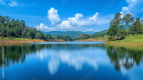 The peaceful Lam Takhong Reservoir with the reflection of the blue sky on the water.