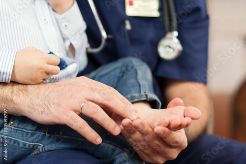 the pediatrician examines the child's feet, the dermatologist treats the heels, foot and heel massage.Concept of examination and treatment of children