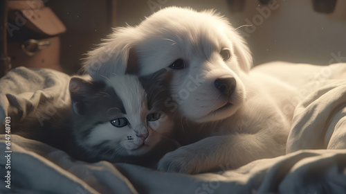 The photo depicts an adorable scene of a puppy and a kitten cuddled together, showcasing the pure innocence and sweetness of their bond. Their tiny bodies rest comfortably against each other, creating