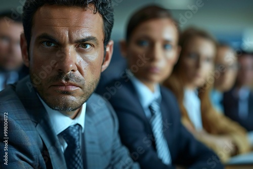 The photo idea is of a bored male manager sitting with his colleagues during a meeting at the office, looking distracted and tense. The image captures the feeling of boredom and tension