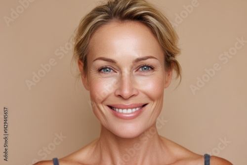 The photo is a stunning close-up side profile of a mature woman with a pretty and ideal appearance, featuring her nude arm and hand touching her cheek
