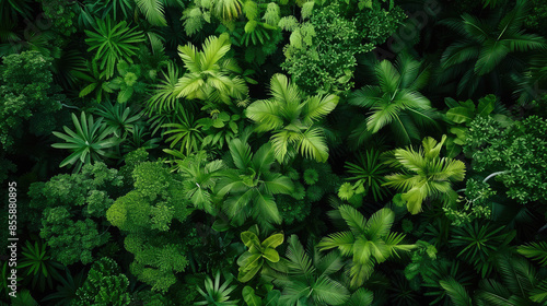 The photo shows an aerial view of a lush green rainforest canopy. The dense vegetation is made up of various shades of green leaves and plants.