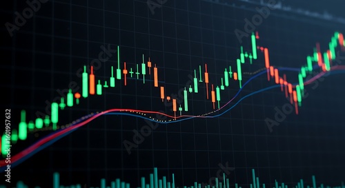 The photograph showcases a vibrant data visualization of market activity, with its contrasting red and green bars and smooth trend lines, symbolizing economic fluctuations and opportunities.