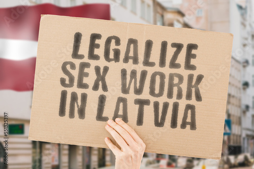 The phrase " Legalize Sex Work in Latvia " is on a banner in men's hands with blurred background. Guide. Govern. Body. Coworker. Crime. Criminal. Democracy. Desire. Employee. Earnings. Dollars