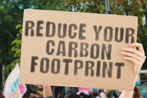 The phrase " Reduce your carbon footprint " is on a banner in men's hands with blurred background. Change. Dioxide. Climate. Economy. Finance. Growth. Think. Emission. Reuse. Friendly. Planet. Protect
