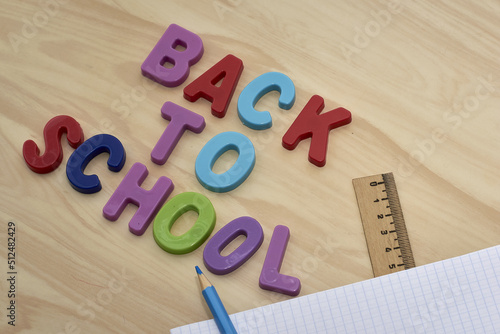 the phrase back to school is laid out in multicolored letters on the table next to a pencil ruler and a notebook with the concept of education school