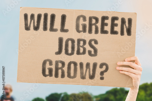 The phrase 'Will Green Jobs Grow?' on a banner in a person's hand. Human holds a cardboard with an inscription. Sustainability. Innovation. Renewable. Opportunity. Development. Economy. Future