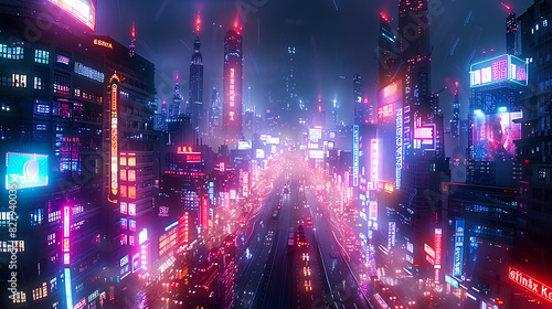 The picture of the neon night time futuristic cyberpunk scifi metropolis yet bright with neon light that fill everywhere of metropolis and fill with tall building and long roadway at night