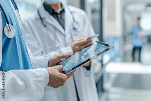 The picture shows a medical team discussing a patient's treatment plan on a digital tablet in a hospital.
