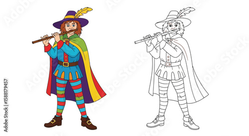 The Pied Piper Coloring Page with Colored and Outline Forms Printable Design