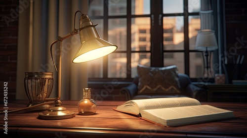 the placement of the open book, the easy chair, and the wooden coffee table.