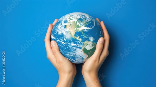 The planet Earth is held tenderly in human hands against a vibrant blue background to highlight