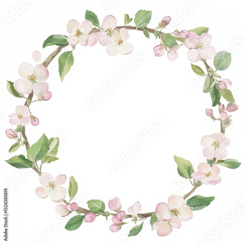 The postcard design consists of a round floral wreath with watercolor pink flowers, including apple and cherry blossoms
