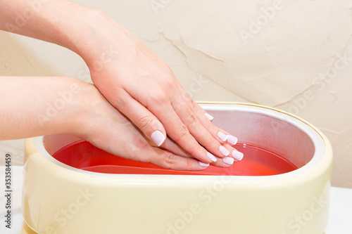 The process of paraffin therapy of a female hand is shot close up in a beauty salon.