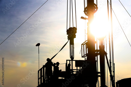 The pumping unit is operating in the oil field in the evening, silhouetted against the sky