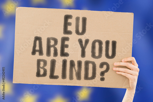 The question " EU are you blind? " on a banner in men's hand with blurred European Union flag on the background. Demonstration. Street. Outdoor. Riot. Disagreement. Government. Protest