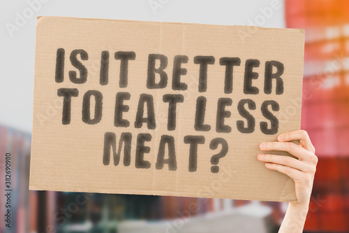 The question " Is it better to eat less meat? " on a banner in men's hand with blurred background. Healthcare. Cruelty free. Meatless. Healthy food. Diet. Animals rights