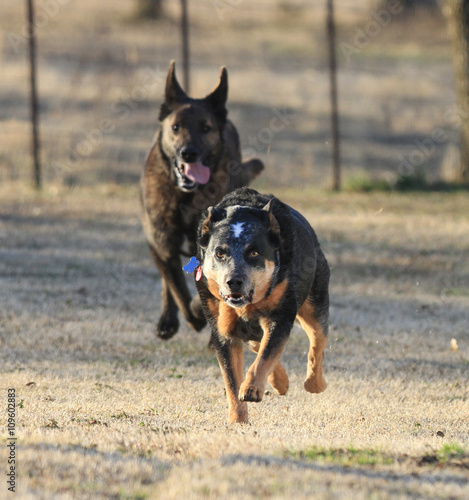 The race is on! Two larger dogs protecting home or racing towards something.