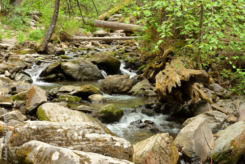 The rapid flow of the stream, bending around stones and fallen trees, flows down from the mountains through the summer forest.