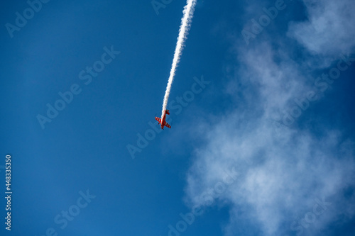 the red plane makes difficult turns and blows white smoke against the blue sky at the Max-21 aerospace salon in Zhukovsky on July 24, 2021