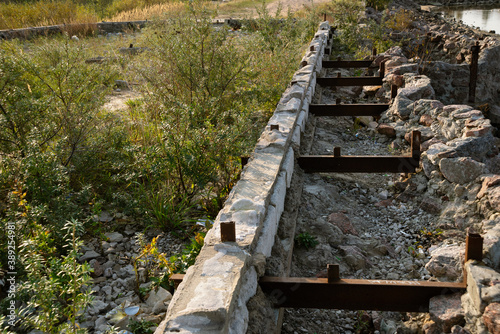 The remains of the foundation with protruding reinforcement, overgrown with bushes