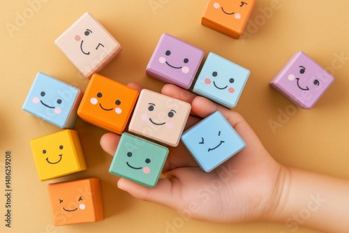 The representation of emotions like sadness, anger, and calmness through colorful cubes with drawings signifies the emotional spectrum of human life and the option to select a joyful path