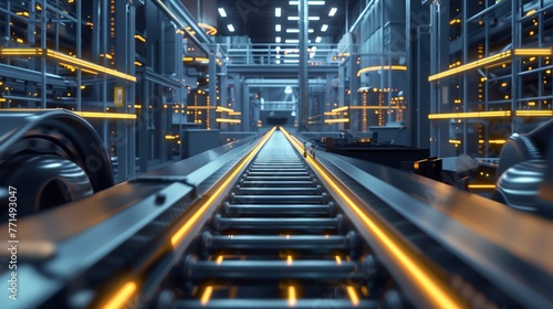 The rhythmic dance of a conveyor belt in a modern factory, framed by the glow of technology and innovation