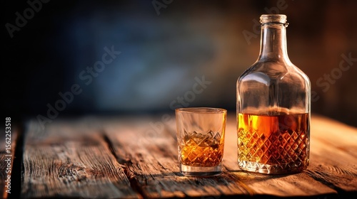 The rich amber whiskey bottle and glass on a rustic wooden table.
